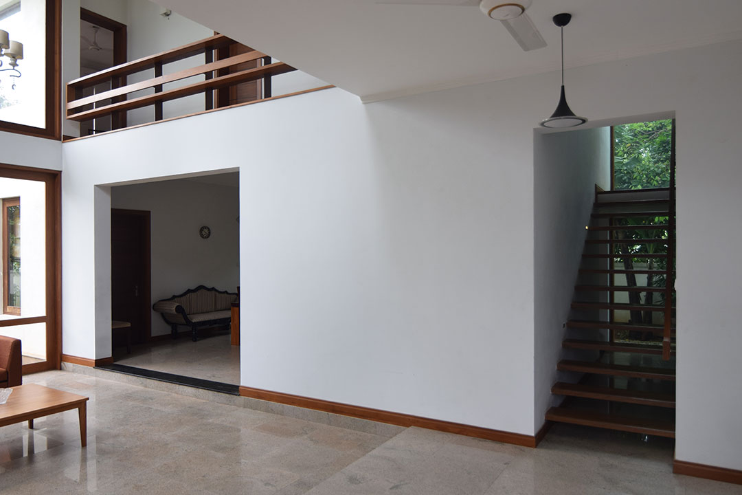 This four bedroomed house wraps around the interior in an L-shaped form with a central transparent staircase that orients one when progressing through the building. The spaces are void of visible columns saving the edges of the building.
